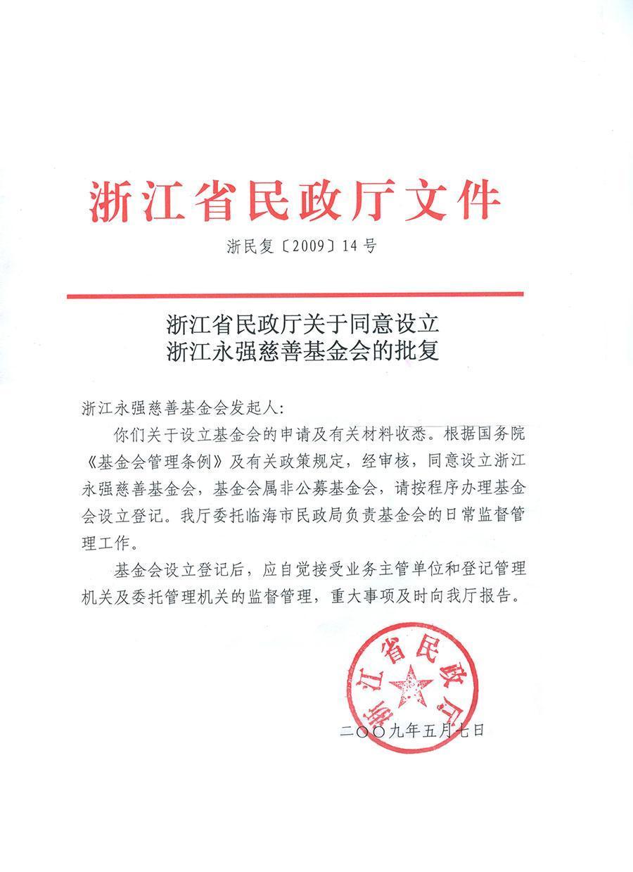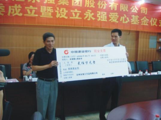 2009年5月,經(jīng)浙江省民政廳批準(zhǔn),永強(qiáng)作為主要捐贈(zèng)人設(shè)立了浙江永強(qiáng)慈善基金會(huì),成為臺(tái)州市首家由企業(yè)出資成立的非公募基金會(huì)。主要致力于救助生活困難的家庭以及貧困家庭的孩子能完成學(xué)業(yè),同時(shí)參與農(nóng)民工技能的提升培訓(xùn)、轉(zhuǎn)移就業(yè)農(nóng)村勞動(dòng)力,為社會(huì)公益事業(yè)、新農(nóng)村建設(shè)、保護(hù)生態(tài)環(huán)境以及社會(huì)經(jīng)濟(jì)的發(fā)展做貢獻(xiàn)。