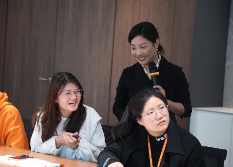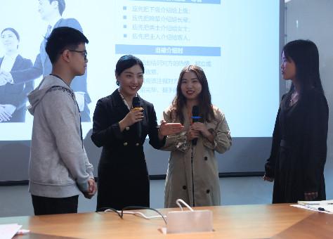 互動環節,陳講師按照事先分好的隊伍,讓各個隊伍選擇隊員上臺,進行了各種情景的商務禮儀的現場演示,同學們都學習的很認真,收益頗多。